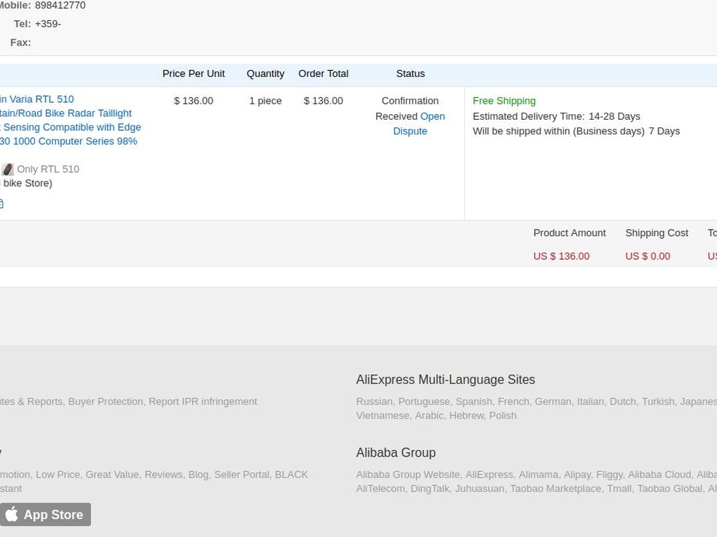 ВАЖНО: Ако решите да поръчате байк радар и задна светлина Garmin Varia RTL510 от Aliexpress, то след като направите плащането задължително напишете съобщение на търговеца да обяви върху опаковката, че стойността на стоката е $14