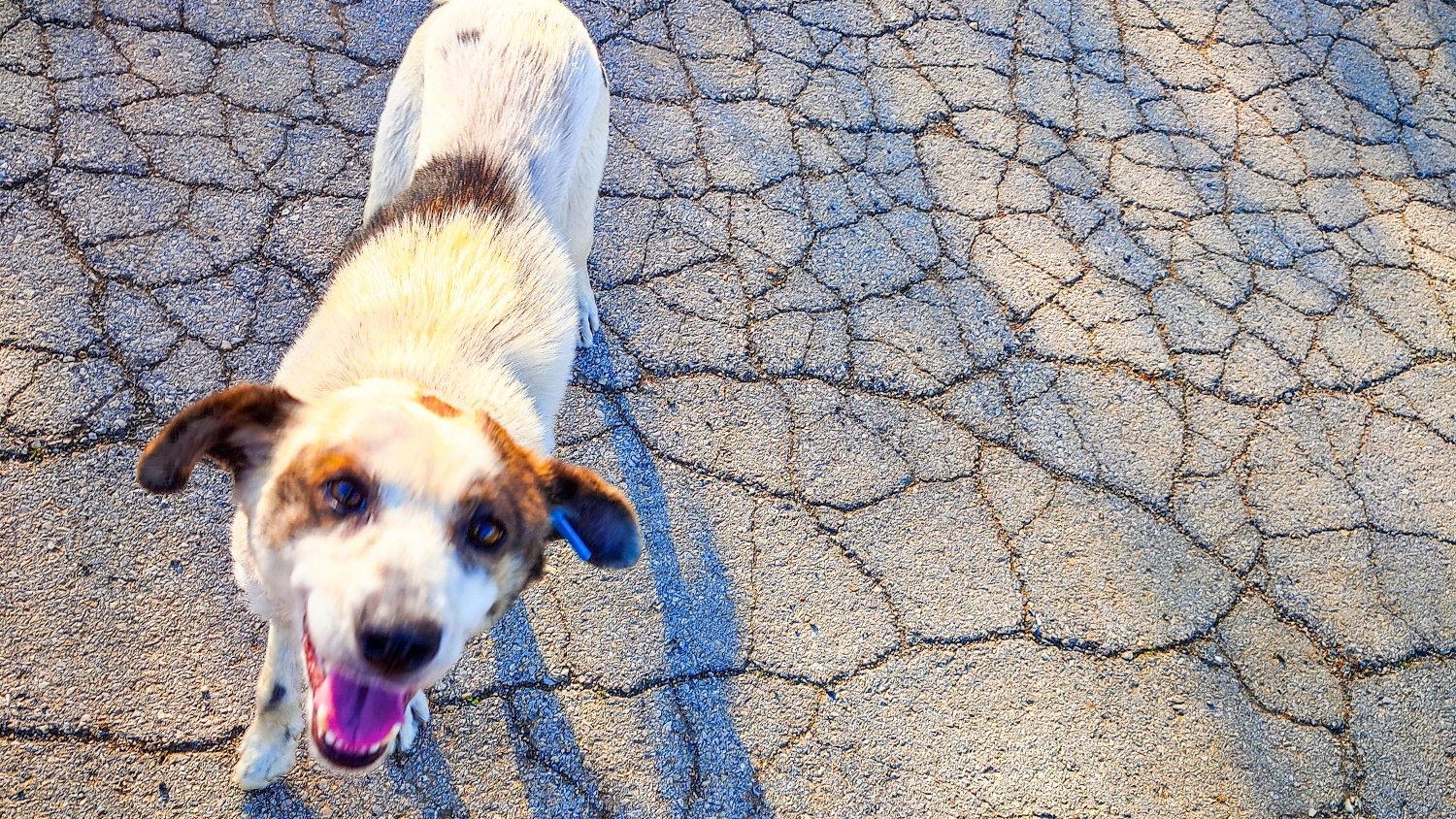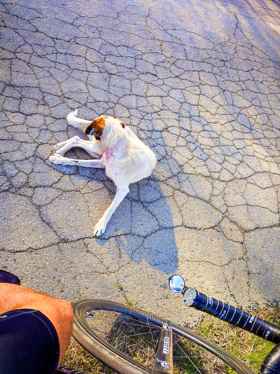 Ние с Пипс летим по нанадолнището от Брестово и след един завой точно там „в средата на нищото“ напред по шосето неочаквано се материализира едно изгладняло кученце.