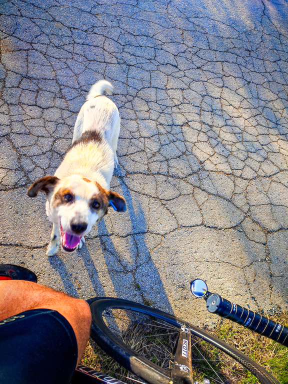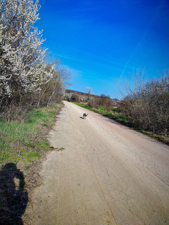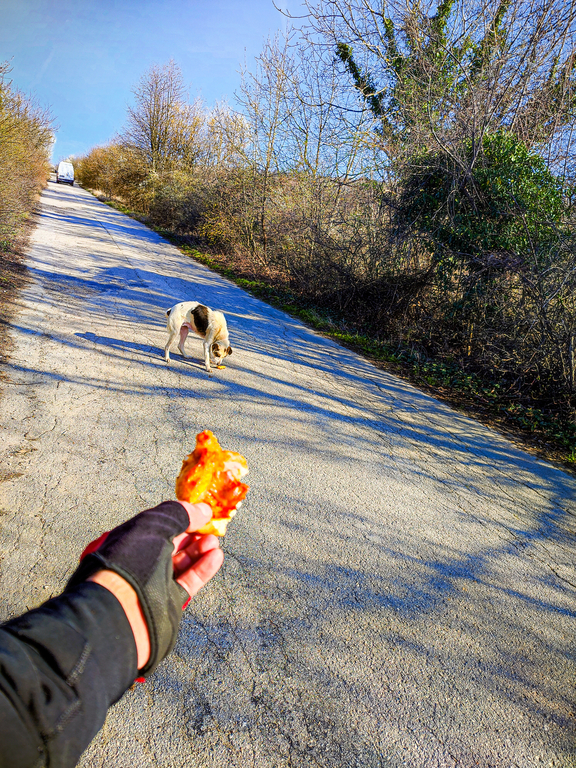 Спрях колелото и направих знак с ръка на шофьора на буса да намали, защото я гледам Бим тича и идва отзад по средата на шосетоIMG 20230324 162325
