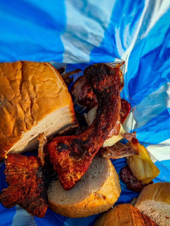 В торбата имаше какво ли не: ПЪРЖЕН ШАРАН! ... някакви филета, кашкавалчета, комати хляб ...