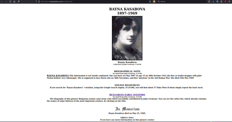 Тя е представена в американския сайт earlyaviators.com със снимка, кратка биография и описание на нейния подвиг по време на Балканската война.