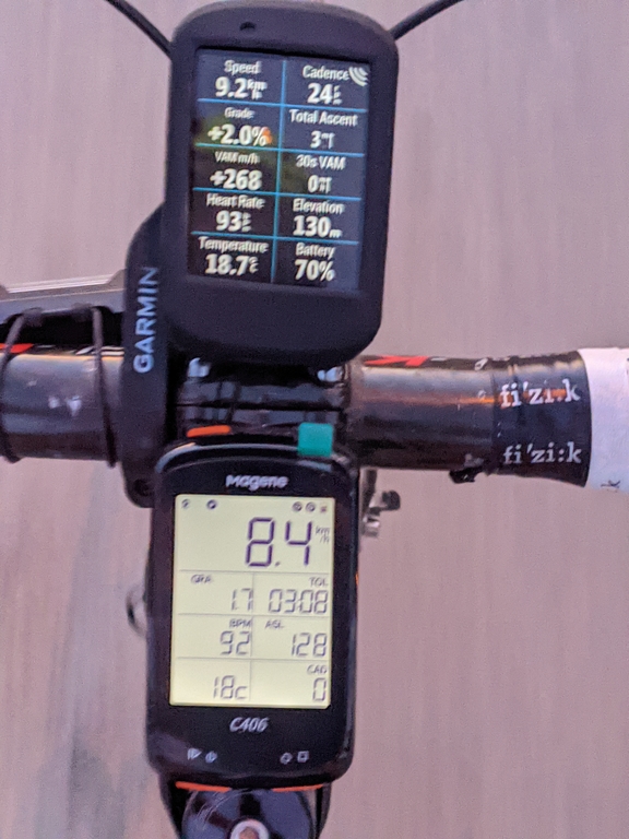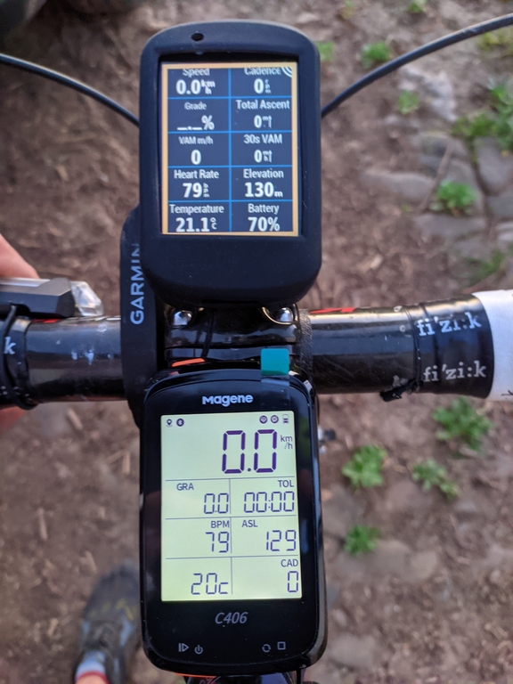 Тъй като имах допълнителна стойка за захващане на Гармин компютъра ми на стема на велосипеда поставих на нея Magene C406 а пред него на стойката която обикновено ползвам поставих и моя Garmin 530 Mandalorian.