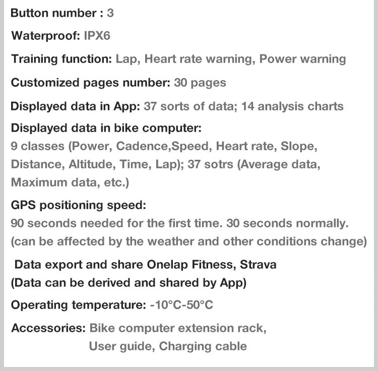 - Външни сензори: скорост, каденс, пулсомер и подръжка на датчик за измерване на мощността (Power meter)