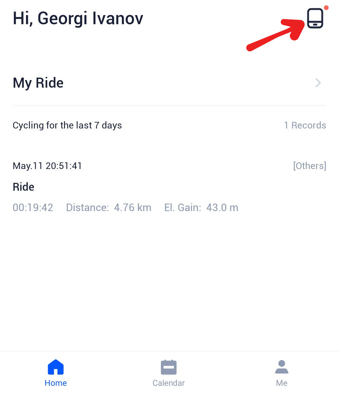 За да свържете велокомпютъра към телефона ви приложението OnelapFit трябва да включите Bluetooth на телефона и да кликнете най-горе в дясно на иконата велокомпютър.
