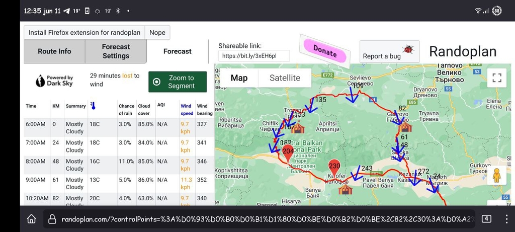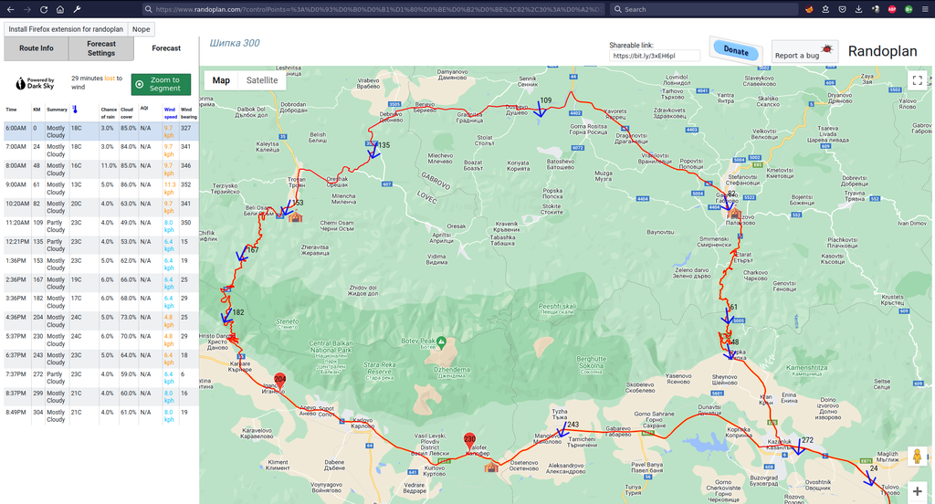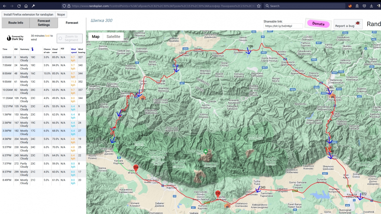 Над картата има меню Shareable link: https://bit.ly/3xEH6pl от където можете да копирате линк към създадената прогноза и да изпратите на групата, с която планирате да карате съответния бревет. :)