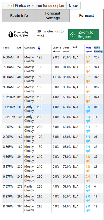 Покрай ценната информация в сайта на американските рандоньори (Randonneurs USA RUSA.org) и групата им във ФБ открих СТРАХОТЕН сайт, с който се правят много подробни и добре изглеждащи прогнози за температура, вероятност от дъжд, посока и скорост на вятър по време на бревет.