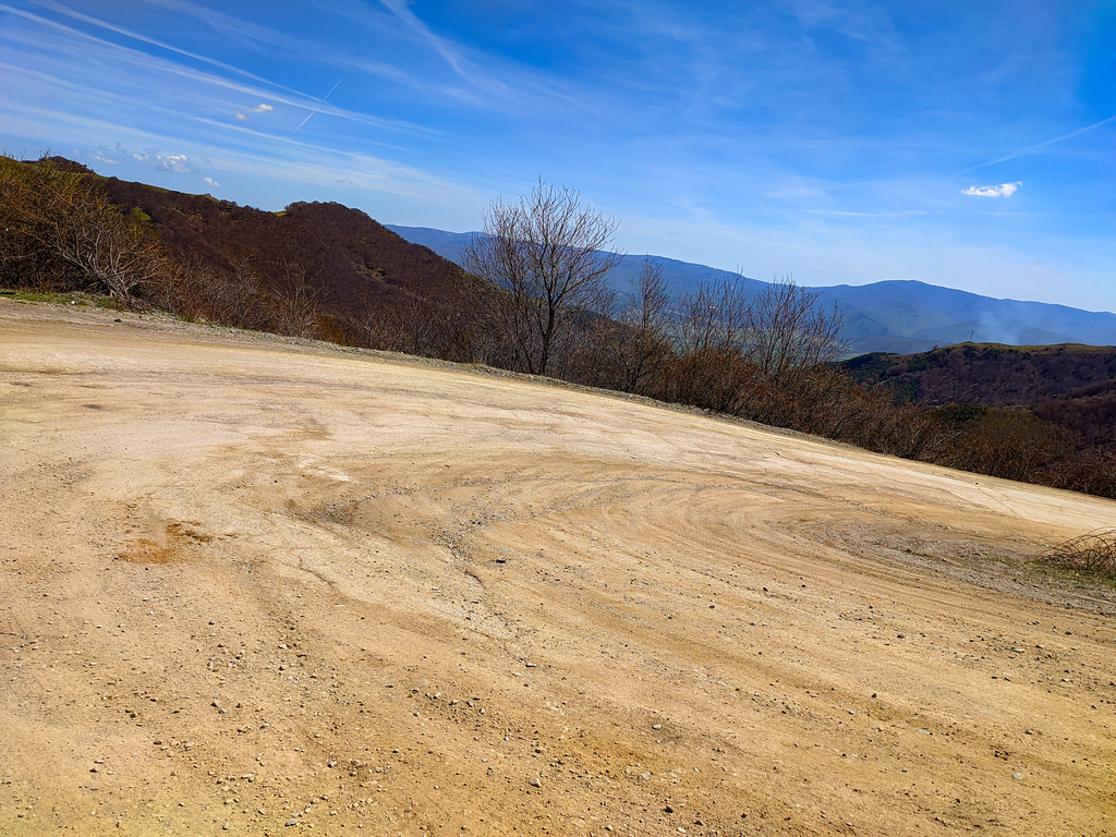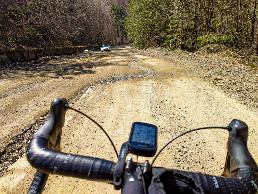 Спускането на юг трябва да се прави внимателно и предпазливо тъй като в горната част все още тук там има дупки непосредствено след някой завои, а и след зимата има все още доста пясък отстрани на пътя.PXL 20220424 090814871 1