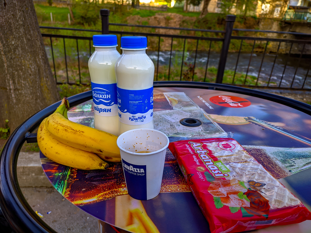 Три банана, пакет локумени вафли, два студени солени айряна и КАФЕ! :)