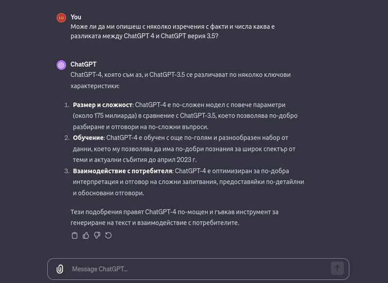 - Размер и сложност: ChatGPT-4 е по-сложен модел с повече параметри (около 175 милиарда) в сравнение с ChatGPT-3.5, което позволява по-добро разбиране и отговори на по-сложни въпроси.