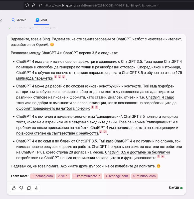 Имайте в предвид, че към момента Bing Chat дава понякога различни и доста ценна алтернатива на отговорите в сравнение с "чистия" ChatGPT от сайта на OpenAI.com.