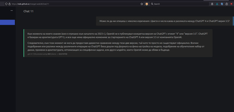 Зададох същия въпрос за последен тест и на най-последната версия на GPT-4 1106-preview достъпна през API-то на OpenAI и бях безкрайно учуден от супер кратки и супер НЕ верен отговор, който получих на стойност точно $0.0107![]()