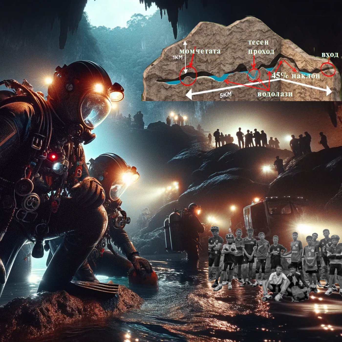 Бързо нарастващото ниво на водата в аводнените подземни тунели първоначално за тях е непреодолимо препятствие и изглежда, че проникването в дълбочина и намирането на момчетата е практически невъзможно.