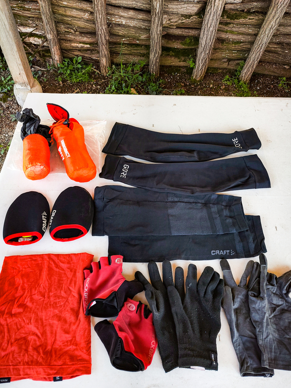 5. Отоплители от неопрен за предната част на обувките (на снимката са под ръкавите) - много ценни при студен дъжд или дълги спускания в Балкана под 10 градуса. Карам четири сезона с летни обувки, но през зимата вместо тях ползвам топли гамаши.