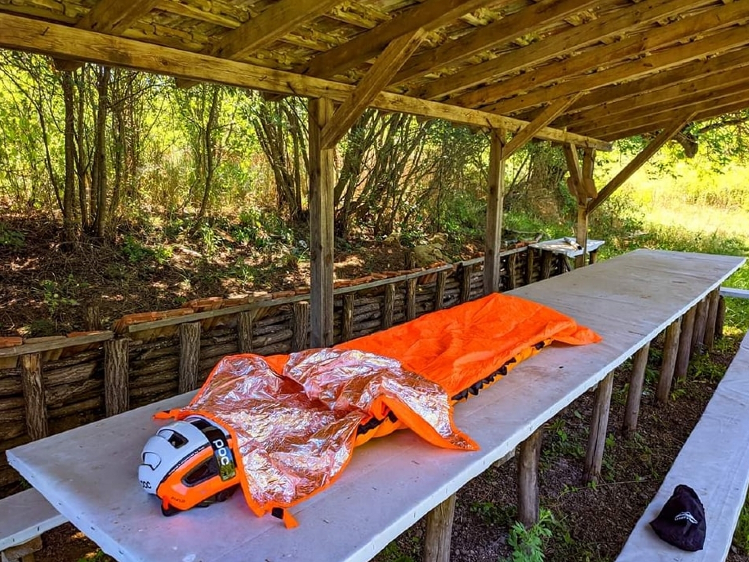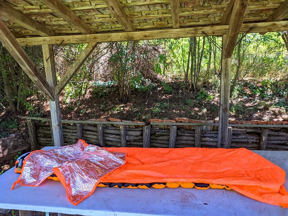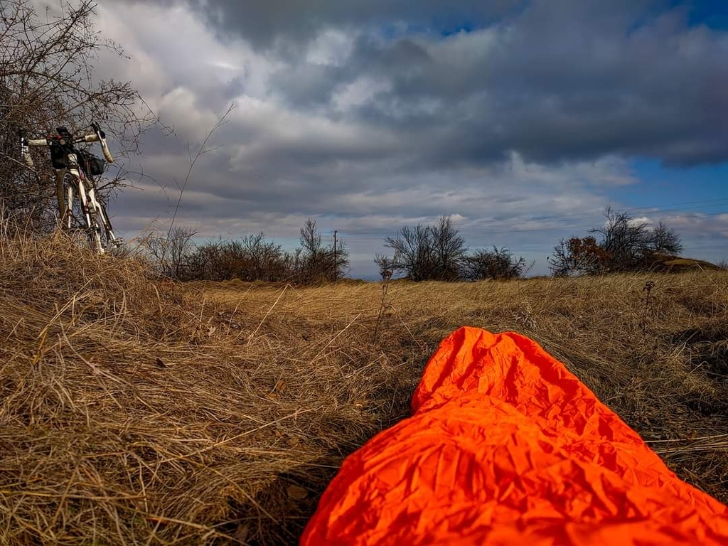 Реших ей така да тествам себе си и ултра лекия ми спален чувал тип спасително одеало (120 гр), което обаче ДИША и не ставате вир вода в него. Ще оцелея ли след кратко дремване покрай пътя на 5℃??? :)