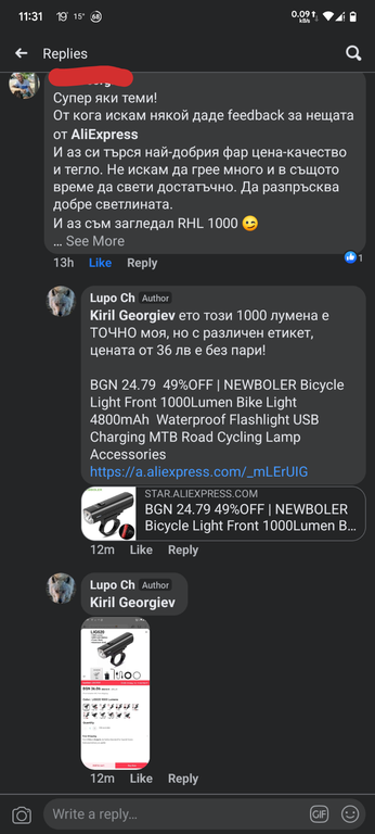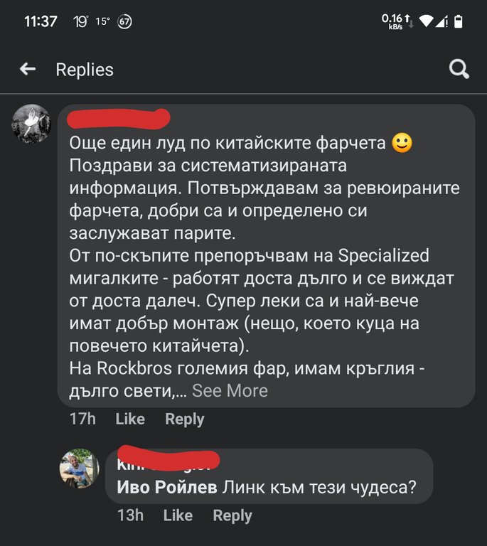 Под поста му разбира се ОТНОВО се разгоря яко нажежена дискусия за добрите фарове за велосипед.Screenshot from 2023 05 11 09 35 21
