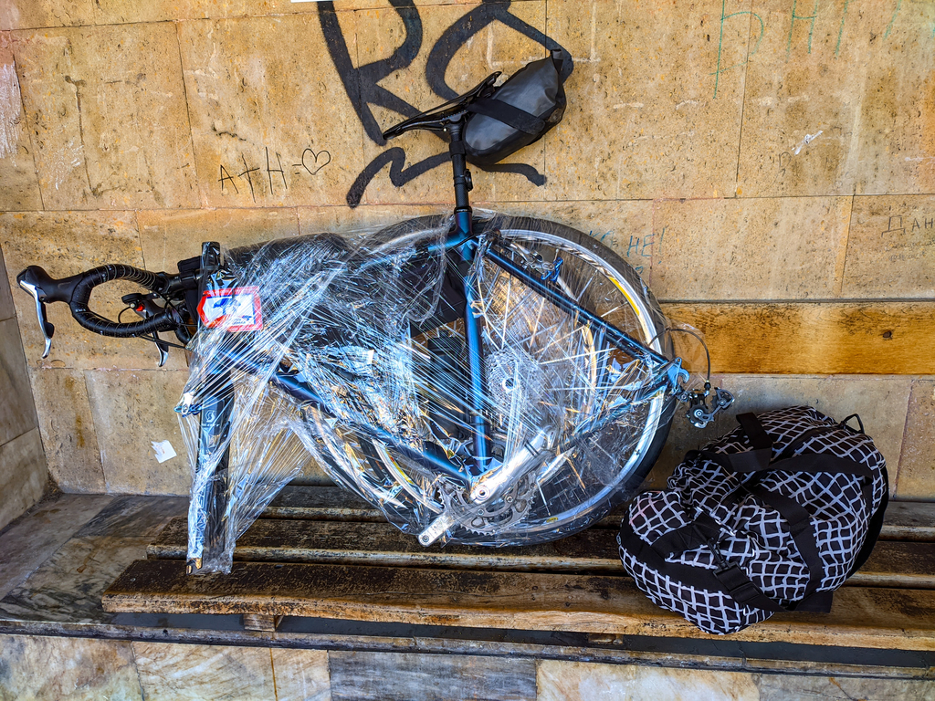 Казаха ми че велосипеда трябва да е опакован, за да не цапа багажа в багажното, така че свалих гумите и веригата и добре го опаковах в стреч фолио.