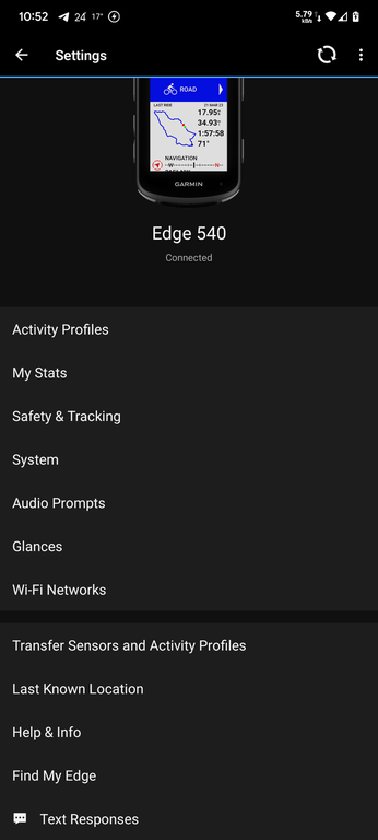 Full configuration of the interface of Garmin Edge 540, Edge 840, and Edge 1040 from the phone