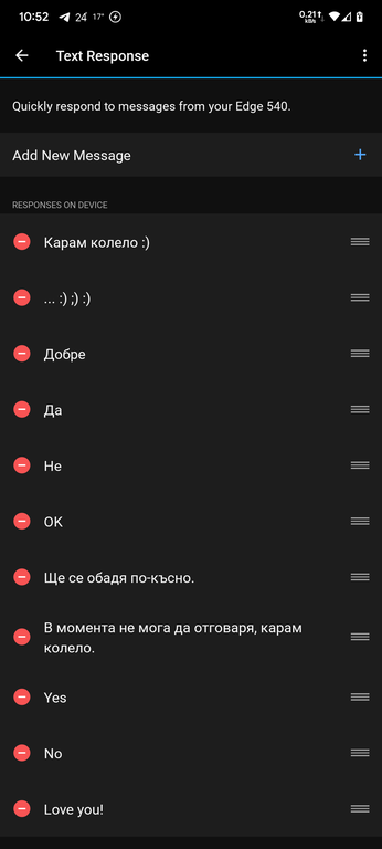 In my old faithful Garmin Edge 530 Mando, I had a list of about 10 pre-defined responses in English, from which I could choose one and send it from the Garmin Edge 530 screen when receiving a message on Telegram or Viber. :(