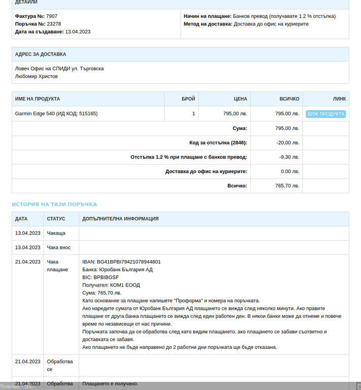 It turns out that with this discount of 20 lv and payment by bank transfer, I am getting a MUCH better price for the Garmin Edge 540 compared to the prices and delivery to Bulgaria from an online store in Germany.