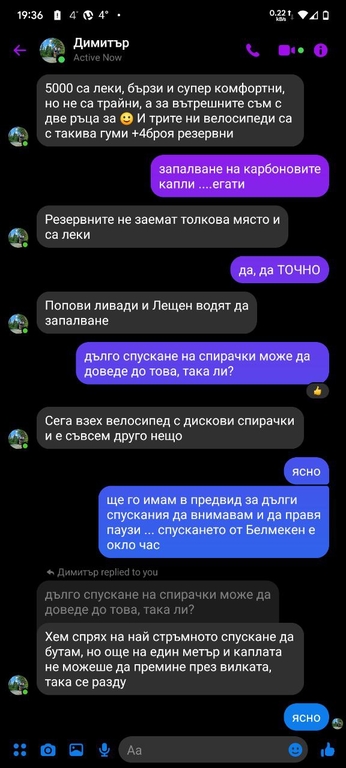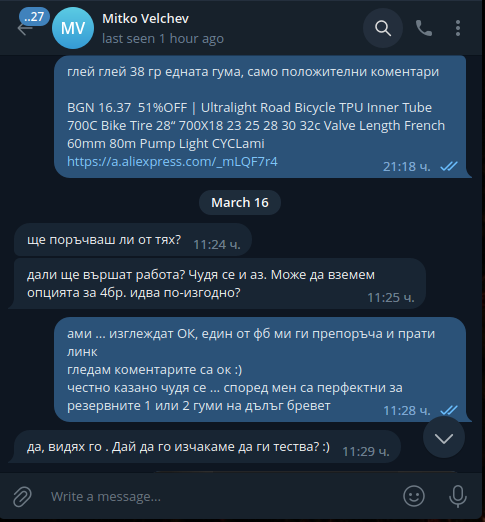 Later, another fellow cyclist, Dimitar, strongly recommended these new TPU tires to me in the Facebook chat. He said he had been using them for a year and a half:![]()